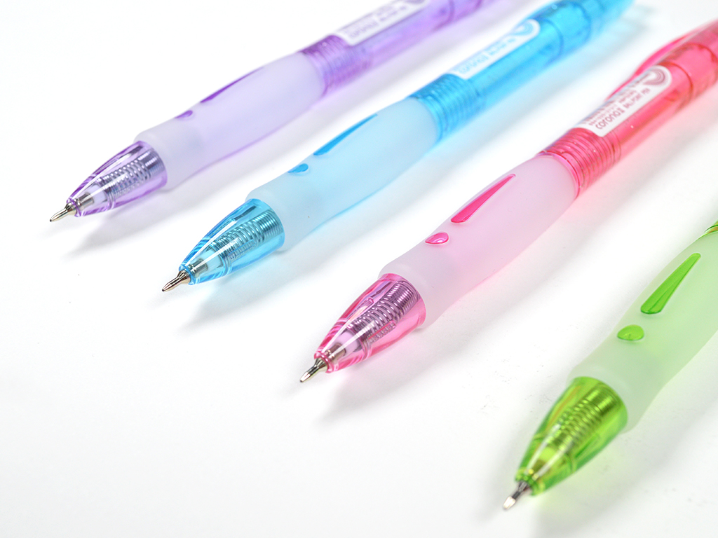 Silmapaistvalt erksates toonides klõpsuga pastapliiats. Kummist sõrmedeosa tagab hea haarde.