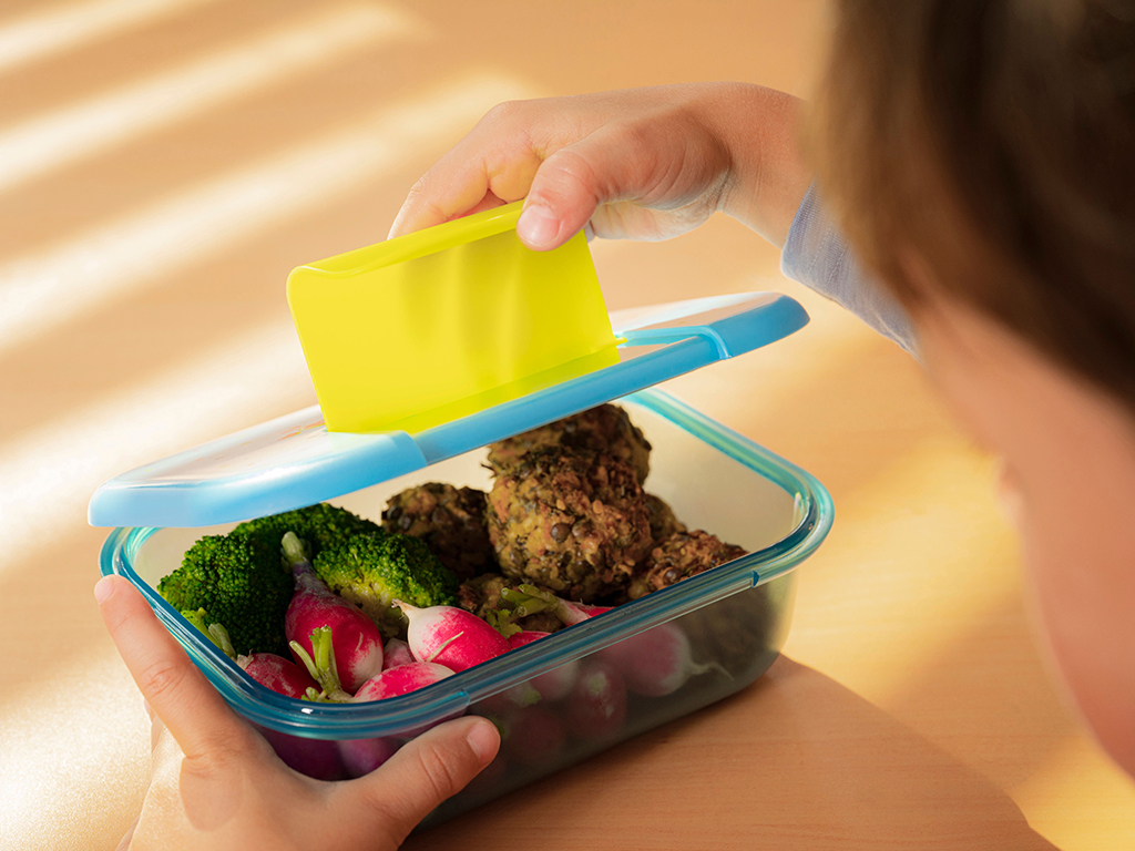 Tänu 900ml mahutavusele ja kompaktsele ristkülikukujulisele kujule mahub see ideaalselt ka koolikotti. Vastupidavast ja keskkonnasõbralikust “Ecozen” materjalist valmistatud toidukarpi võib pesta ka nõudepesumasinas (ülemisel restil) ja kasutada mikrolaineahjus (kaas avatuna).